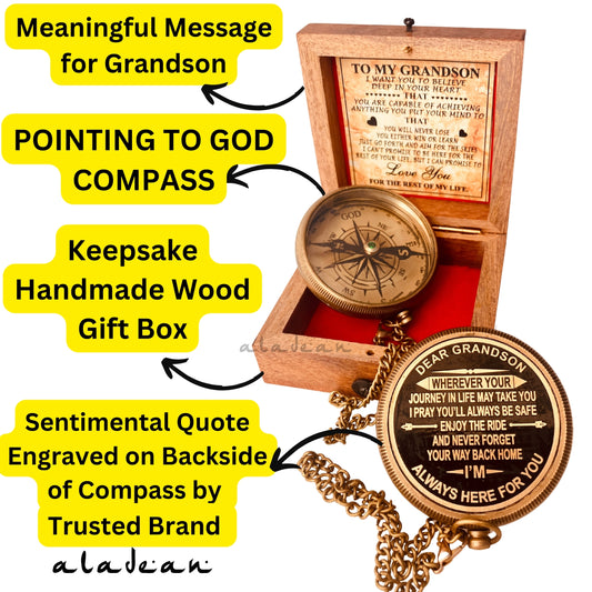 Gift for Grandson Brass Compass Engraved Quote | Memory Present to My Grandson Birthday, Baptism, Graduation, Confirmation, Love, Gift idea by Grandpa Grandma