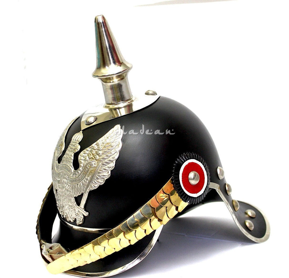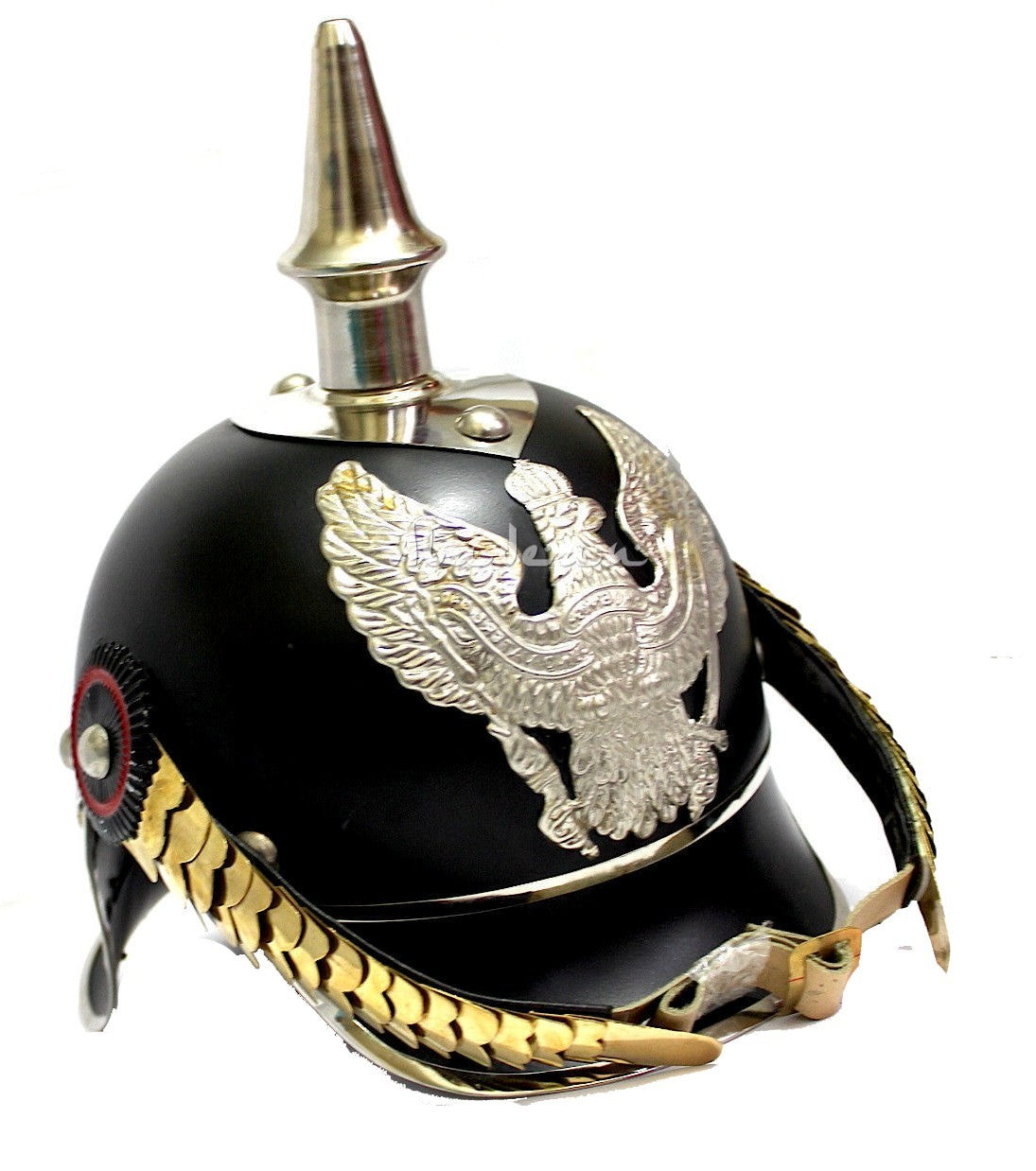 Der deutsche Pickelhaube-Lederhelm der Line Officer Preußen ist ein sorgfältig handgefertigtes Stück von Aladean®, einem vertrauenswürdigen Hersteller von Pickelhaube-Helmen. Dieser Helm ist eine Nachbildung der kaiserlichen deutschen Militärkopfbedeckungen aus dem Ersten und Zweiten Weltkrieg und zeigt die reiche Geschichte und Handwerkskunst dieser Zeit.