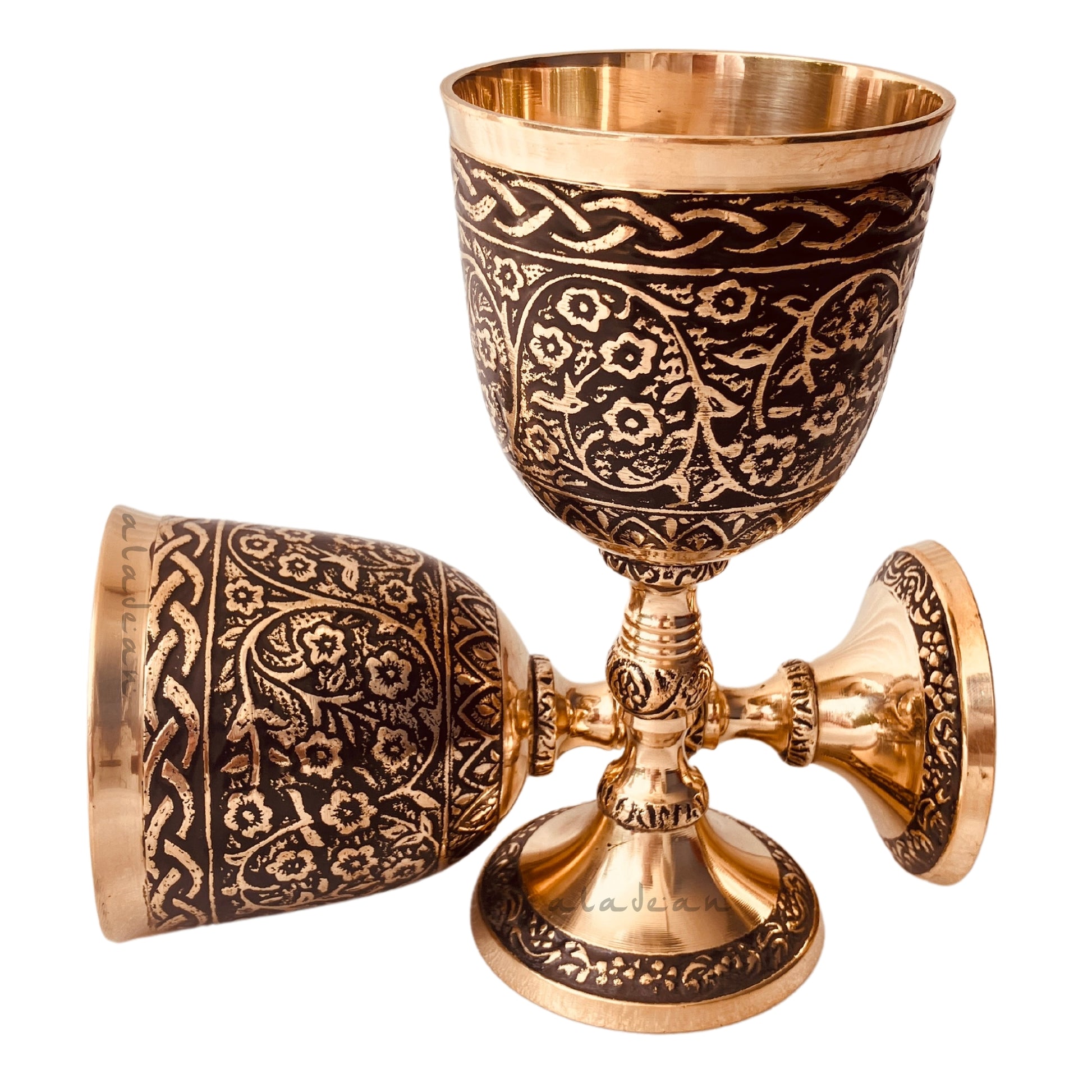 Der Besitz dieses Kelches vermittelt Ihnen ein Gefühl von Glück und Königlichkeit. Stellen Sie sich vor, Sie halten ein Stück Geschichte in Ihren Händen, spüren das Gewicht von massivem Messing und die komplizierten Muster, die die Erhabenheit der Antike widerspiegeln. Es weckt ein Gefühl von Freude und Stolz und erinnert an königliche Bankette und große Feiern. Die mit diesem Kelch verbundene Stimmung ist zeitlose Eleganz und eine Verbindung zu einer königlichen Vergangenheit, sodass sich jeder Schluck wie ein Toast auf Geschichte und Tradition anfühlt.