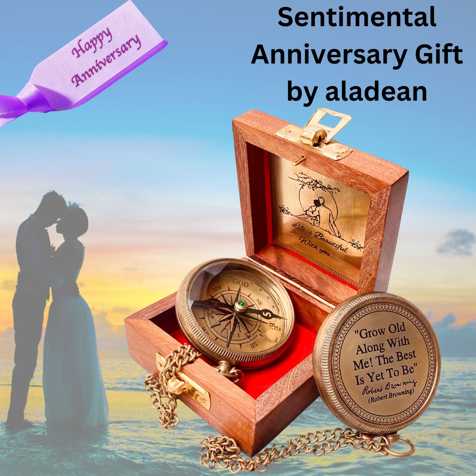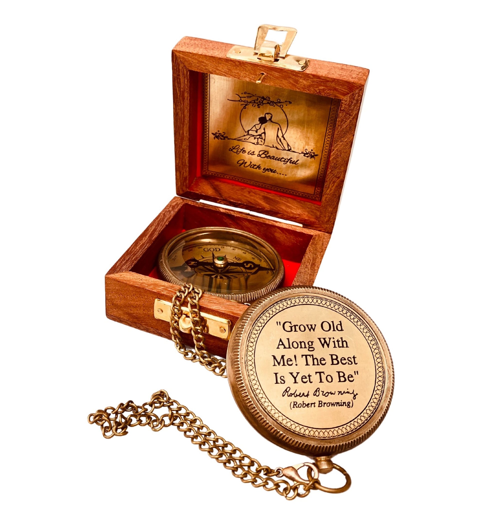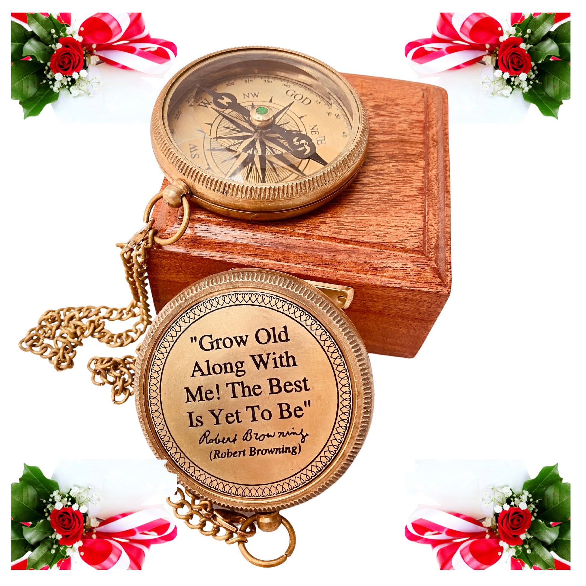 Offrez-vous un amour éternel avec notre boussole en laiton avec citation romantique pour amoureux. Fabriquée à la main en Inde avec une célèbre citation d'amour gravée : « Vieillir avec moi, le meilleur reste à être ! », cette boussole en laiton symbolise un lien romantique éternel. Impressionnez votre proche avec ce cadeau unique, idéal pour la Saint-Valentin, les anniversaires ou les demandes en mariage. Livré dans une boîte en bois magnifiquement faite à la main.