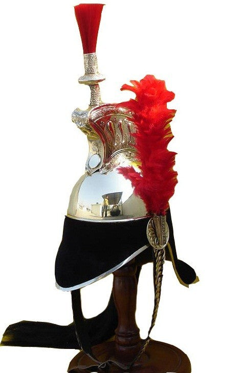 Offrez-vous ce casque napoléonien fabriqué à la main par Aladean, réputé pour sa sélection de casques blindés vintage. Doté d'une longue queue de crin de cheval s'écoulant de façon spectaculaire du haut du peigne et d'un panache rouge distinctif ornant le côté gauche du crâne, ce casque de cuirassier est méticuleusement fabriqué à partir de laiton de qualité supérieure. Sa finition argentée et sa doublure intérieure en cuir réglable en font un ajout merveilleusement sophistiqué à la fois à toute collection et à toute garde-robe luxueuse. Fabriqués avec la plus haute précision à partir d'acier doux, ses raccords et sangles les meilleurs de leur catégorie sont fabriqués à partir du laiton le plus fin. Avec sa construction supérieure et sa finition raffinée, ce casque napoléonien est une pièce maîtresse qui mérite sa place dans le luxe. Confort et qualité se combinent pour créer un produit haut de gamme qui peut être porté et apprécié avec fierté. Ce casque offre une protection supérieure, vous permettant de le porter en toute confiance. Sa doublure intérieure en cuir confortable et sa coupe réglable en font une pièce luxueuse à porter avec fierté.