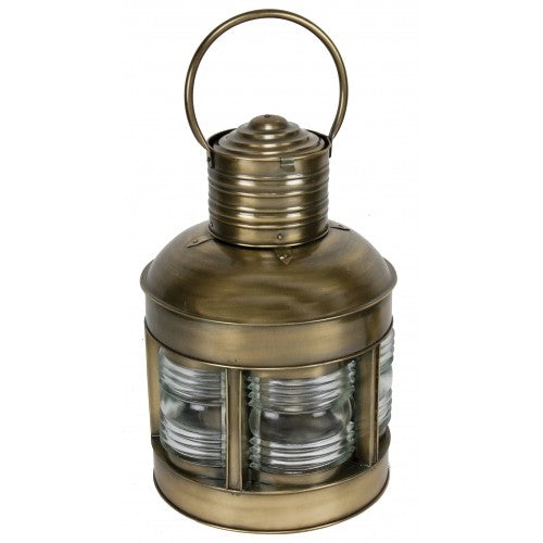 The Lighthouse Oil Lamp mirrors the brass model, featuring 5 heavy glass Fresnel lenses that beautifully refract light. Standing at a height of 17 inches, this lantern is not only functional but also serves as a captivating decorative piece.