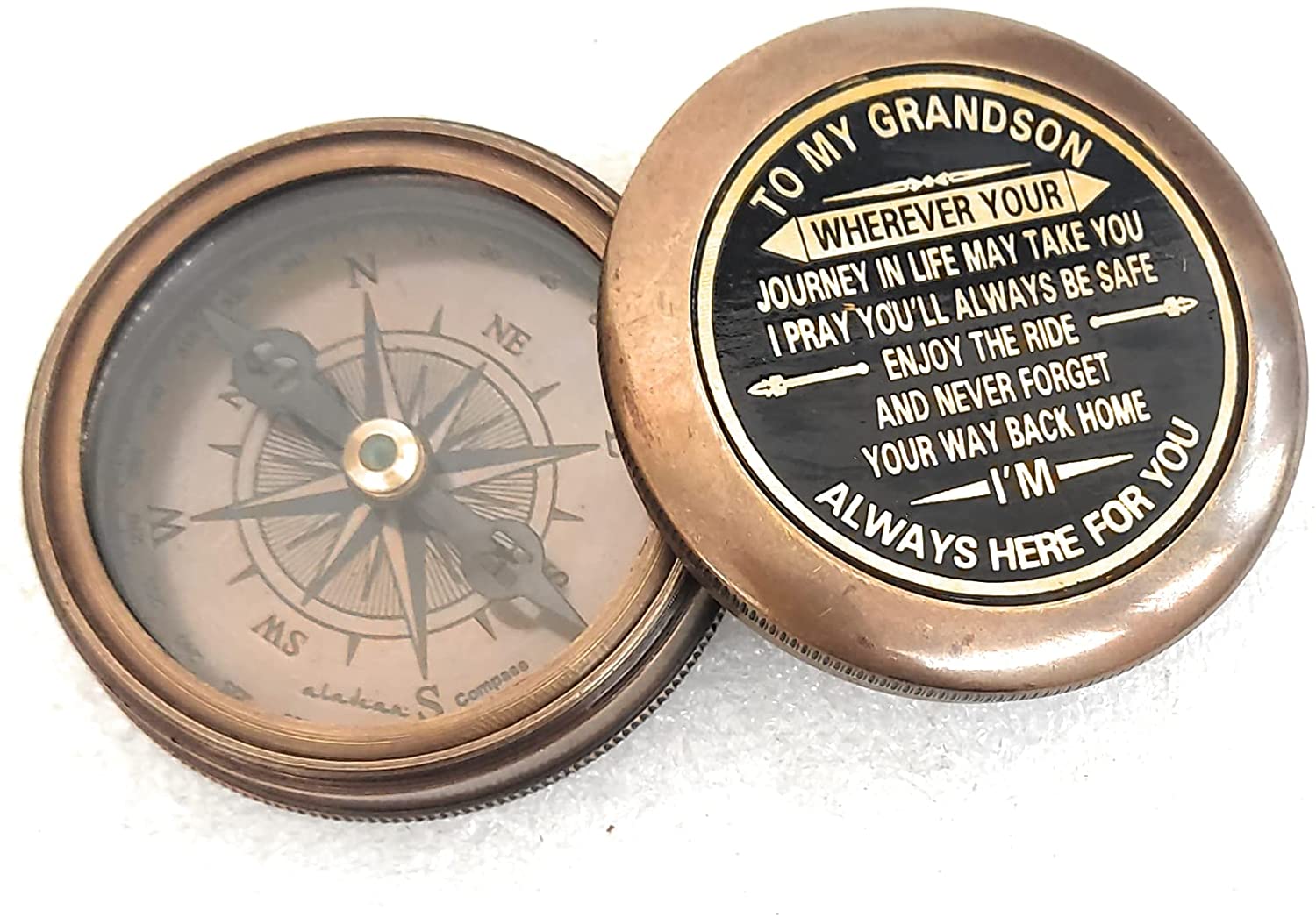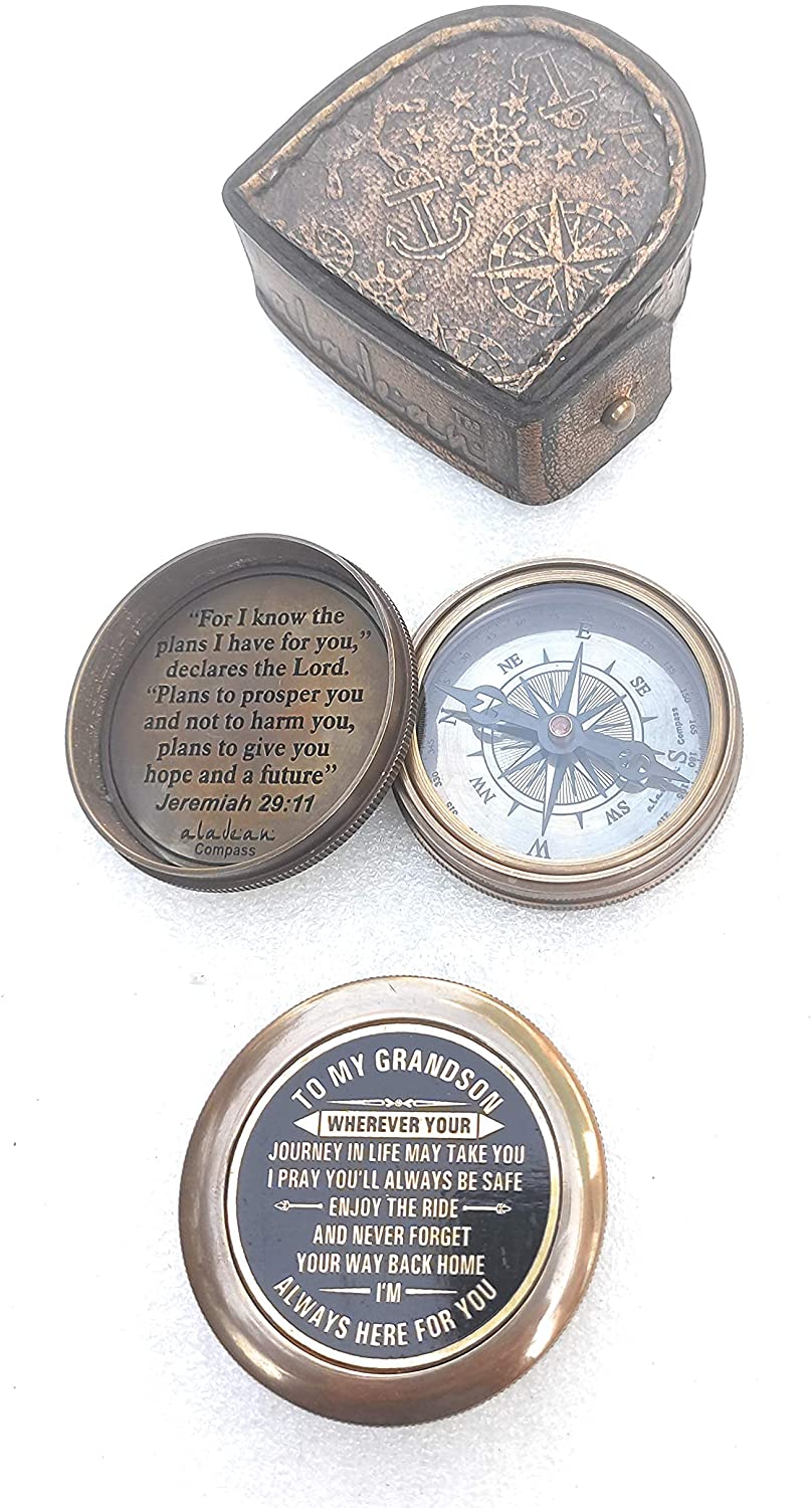 Gift for Grandson from grandpa Grandma - Engraved Antique Style Brass Compass - Reinforcing Reminder of Love & confidence for Grandson's Gift idea for boys on Birthday, Baptism, Confirmation, Graduation gift for Him, Boy from grand mother & grand father. Surprise your Boy, grandson / Godson with this unique Birthday gift , Religious Baptism gift, Inspirational Graduation gift, Uplifting Confirmation gift that is themed & designed as Uplifting, religious, missionary, motivational, baptism, success celebration, Christmas, Party & Festival gift for all ages.