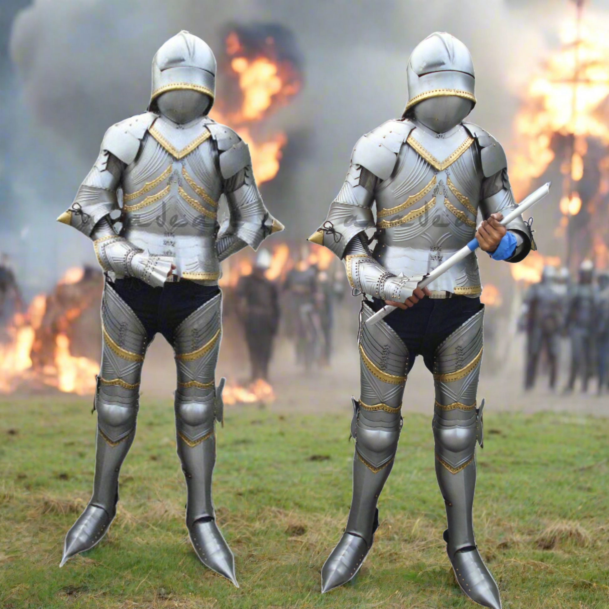 Step into the captivating world of medieval Europe with Aladean’s Regal Warrior Outfit, an awe-inspiring Gothic Armor set inspired by the courageous Archduke Sigismund von Tirol. This armor pays homage to the chivalric culture of 15th-century Europe, when knights in full metal suits symbolized honor, strength, and loyalty. Handcrafted from premium 18-gauge mild steel, this armor is a testament to Aladean’s commitment to blending historical accuracy with top-tier modern craftsmanship. Ideal for historical enthusiasts, collectors, LARP aficionados, and cosplay enthusiasts, this suit is wearable art that breathes life into the allure of a medieval warrior.